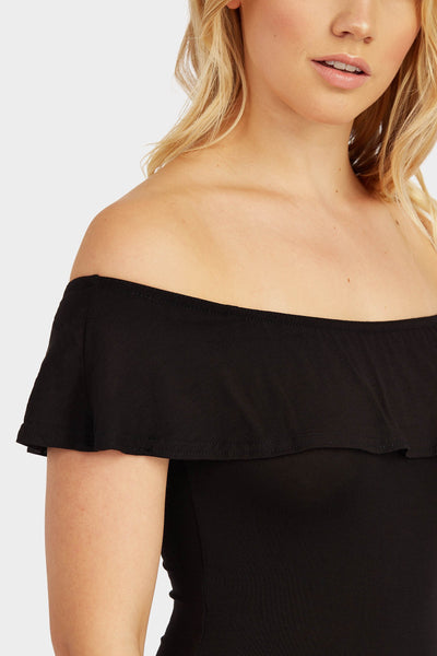 Black off shoulder ruffle mini dress